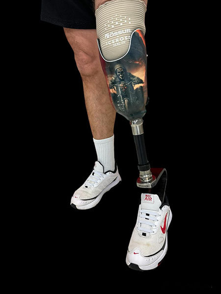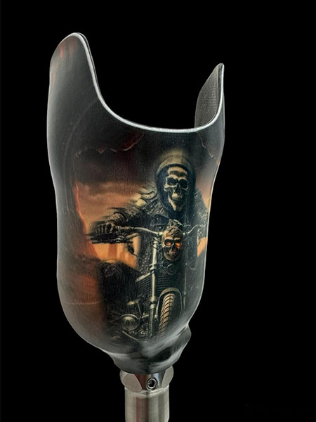 Motif « ghost rider » sur demande réalisé par notre équipe sur cette prothèse tibiale, équipée du pied Challenger.Une belle prothèse pour Vincent qui, grâce à ce pied hybride, retrouve du confort à la marche et peut également reprendre les footings.