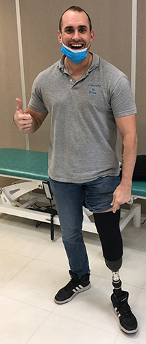 Gilles a enfin reçu sa prothèse tibiale définitive qu'il utilise au quotidien pour travailler et pratiquer son activité sportive. Munie d'un pied Re-Flex classe 3 de chez Ossur, d'un amortisseur de choc et d'une torsion cheville, il en est ravi.